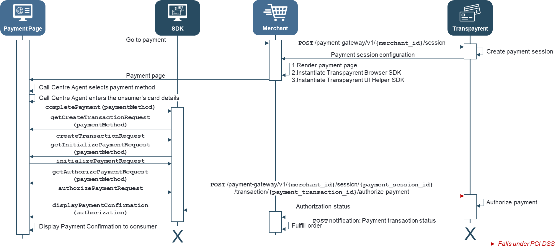 The sequence diagram below illustrates the complete flow for authorizing the payment for a payment transaction as Mail Order / Telephone Order (MOTO) using the Transpayrent SDK:
